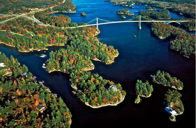 千岛湖是大冰川时期的产物,与大西洋相通,共有大小岛屿1865个。湖中心的分界线将千岛湖一分为二,南岸是美国的纽约州,家家悬挂美国国旗。北岸则是加拿大的安大略省,多数悬挂加美两国国旗。在1865个岛屿中,2/3在加拿大境内,而美国拥有的岛屿大都面积大并有深水水道通往五大湖(GREATLAKES),大湖由加美边界的5个湖组成:安大略湖、伊利湖、苏必利尔湖、密执安湖和休伦湖。在千岛湖上,一座连接美国和加拿大的国际大桥横跨美加两国的边境,大桥宛如一条天然彩虹,为千岛湖增加了几分娇艳。桥的中央就是两国的分界,上面有无人值守的海关。 千岛湖一年四季风景秀丽,在夏季更是有名的避暑胜地。